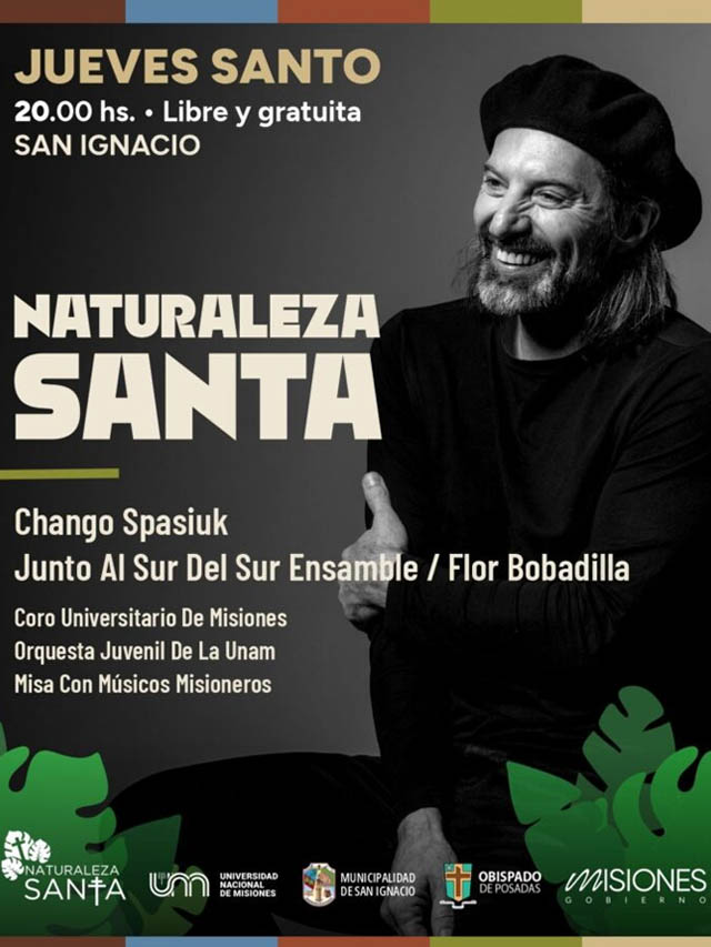 Uno de los momentos destacados será la Misa de las Misiones, prevista para el jueves 2 de abril a las 20 horas en el Conjunto Jesuítico Guaraní de San Ignacio Miní. La ceremonia será presidida por el obispo de Posadas, Juan Rubén Martínez, y contará con la participación de músicos misioneros. Al finalizar, se presentará un espectáculo encabezado por Chango Spasiuk junto a Sur del Sur Ensemble, Flor Bobadilla, el Coro Universitario de Misiones y la Orquesta Juvenil de la Universidad Nacional de Misiones.